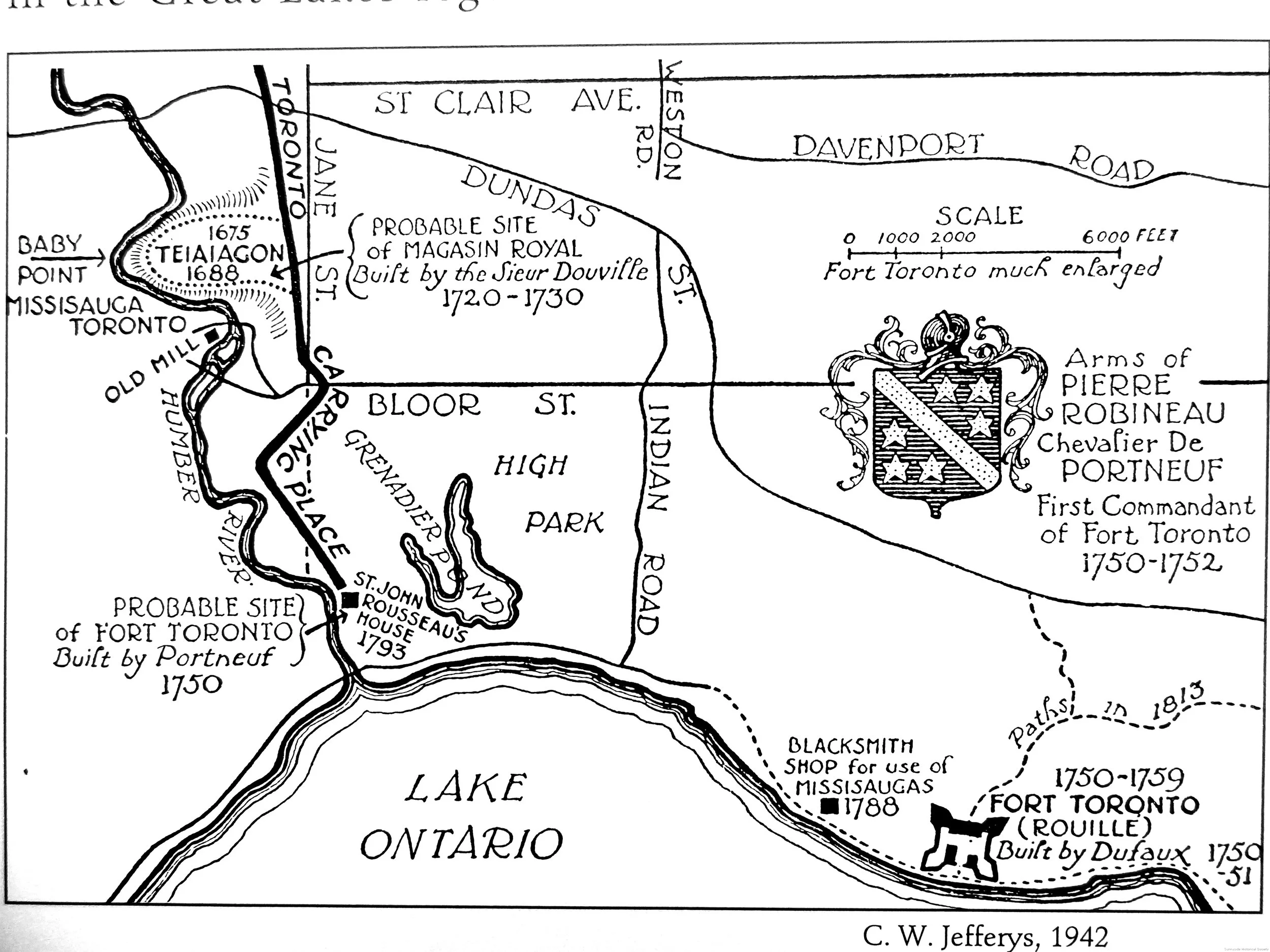 Teiaiagon was abandoned after being burned to the ground, and it was not until 1716 that the site was again home to a permanent structure. The Douville brothers constructed a trading post called Le Magasin Royal (also known as Fort Douville) believed to be near the site of the Baby Point Club where European items such as buttons, shirts, ribbons, combs, knives, looking glasses, axes, flour, lard, salt, pepper, prunes, raisins, olive oil, tobacco, vermillion, powder and shot were exchanged with trappers and aboriginal people for furs and pelts. Architecturally, Le Magasin Royal was described as ‘little more than a log cabin,’ but its significance lies in it being the first non-Aboriginal building in the Toronto area. The site was again abandoned in 1730 as new sites were built closer to Lake Ontario.