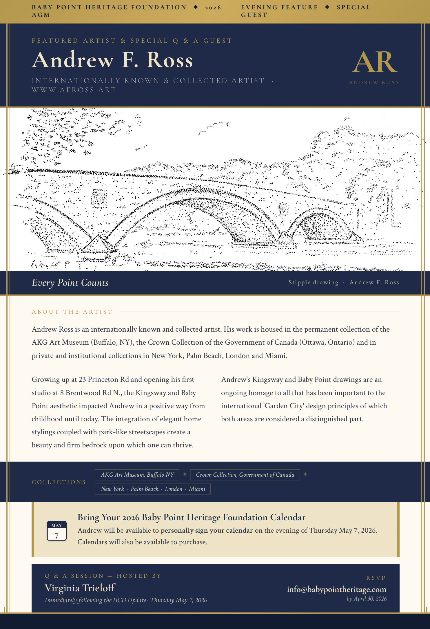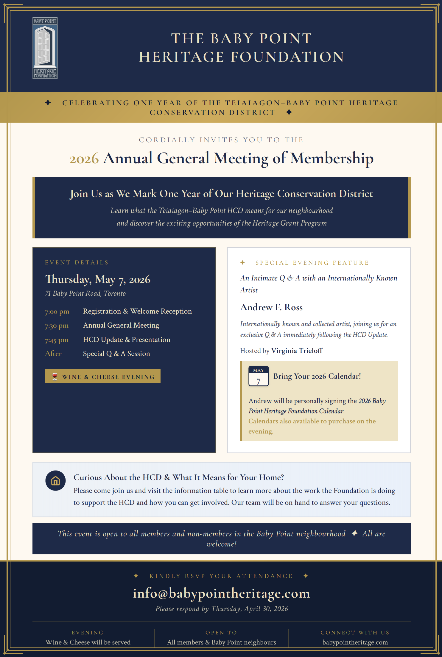 Please join us for the Upcoming 2026 Annual General Meeting of Membership, open to both members and non-members of the Baby Point neighbourhood community. All neighbours are welcome; this year’s guest speaker will be artist Andrew F. Ross (the artist behind the 2026 BPHF Calendar), and will be hosted by Virginia Trieloff.